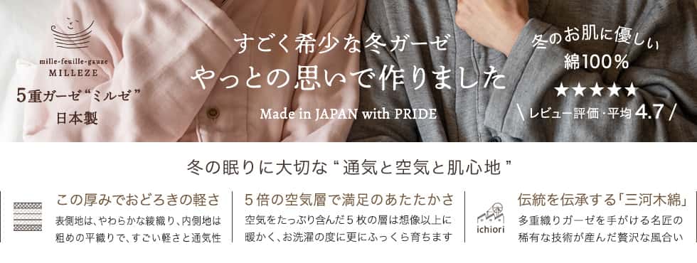 その高い技術を用いて丁寧に作られた5重ガーゼミルゼ®のシングルブラケットはパジャマ屋IZUMMオリジナルです。原料の糸染めから、織り、縫製、検査、梱包に至るまでの全工程を国産にこだわっています。