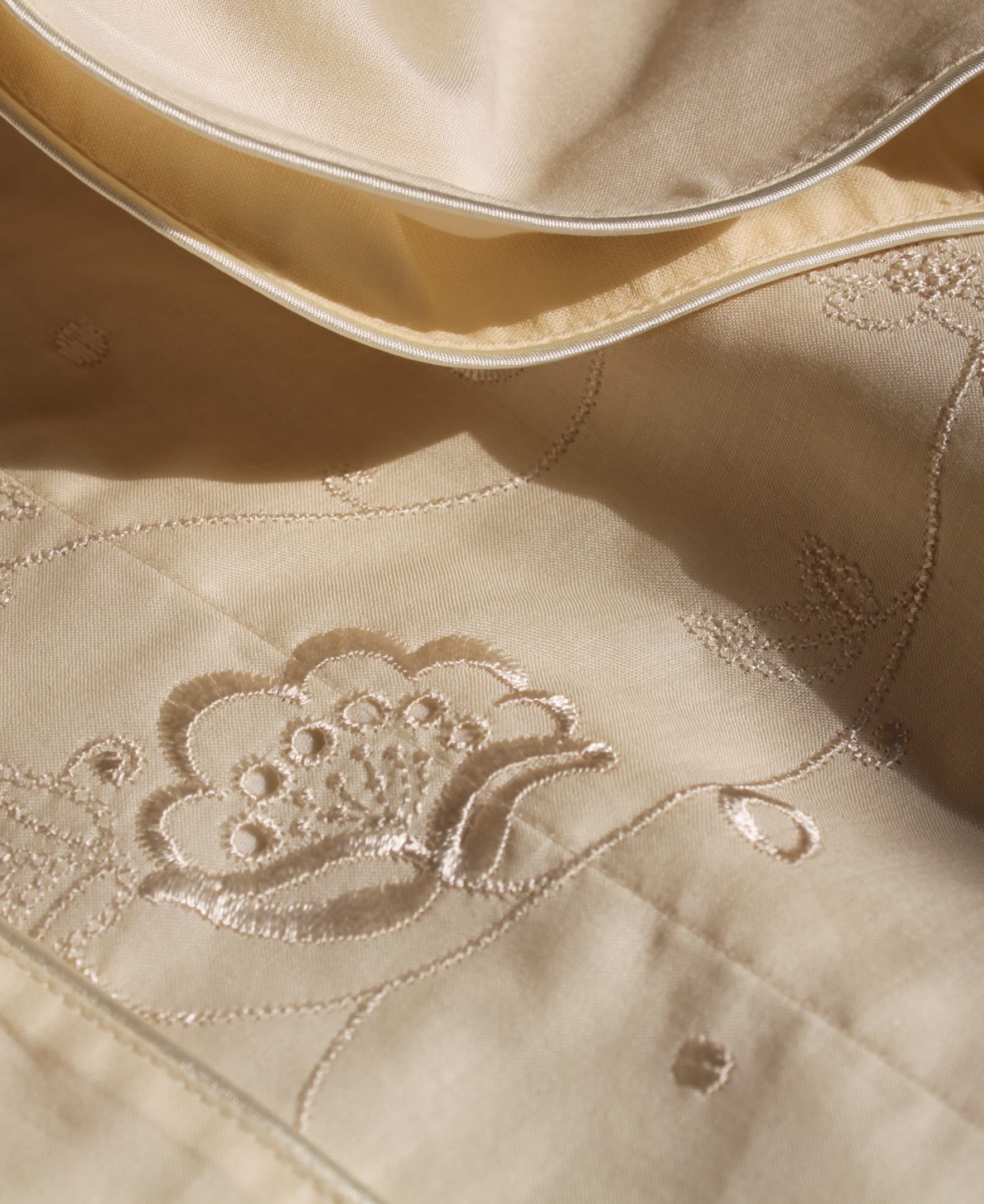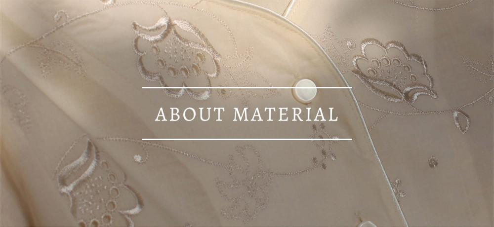 刺繍は生地と同じカラーで、上品な光沢のあるレーヨン糸を使い、優美な質感に仕上げました。