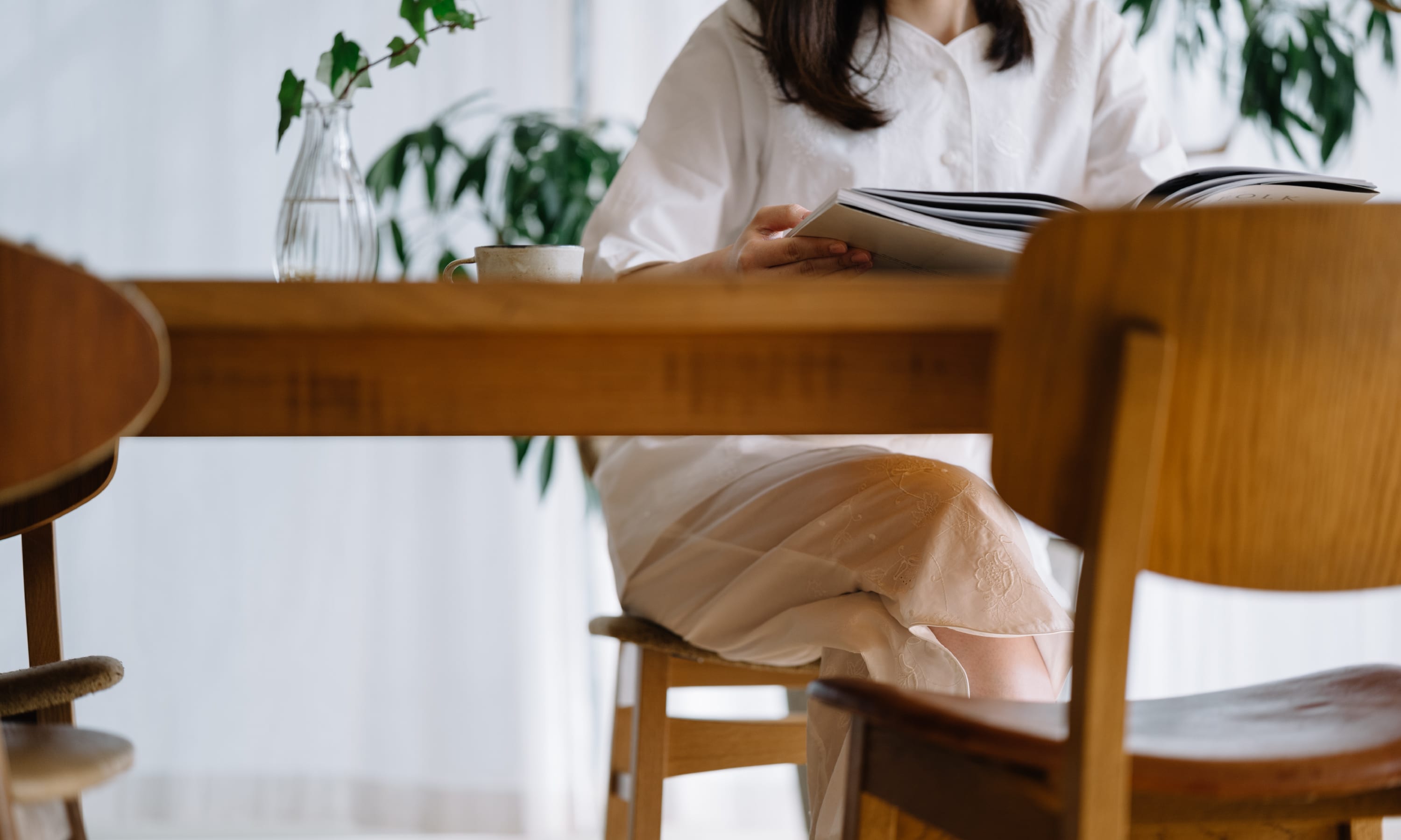 女性らしいラウンドカットの袖口は、すとんとした8分袖で手首が華奢に見えます。