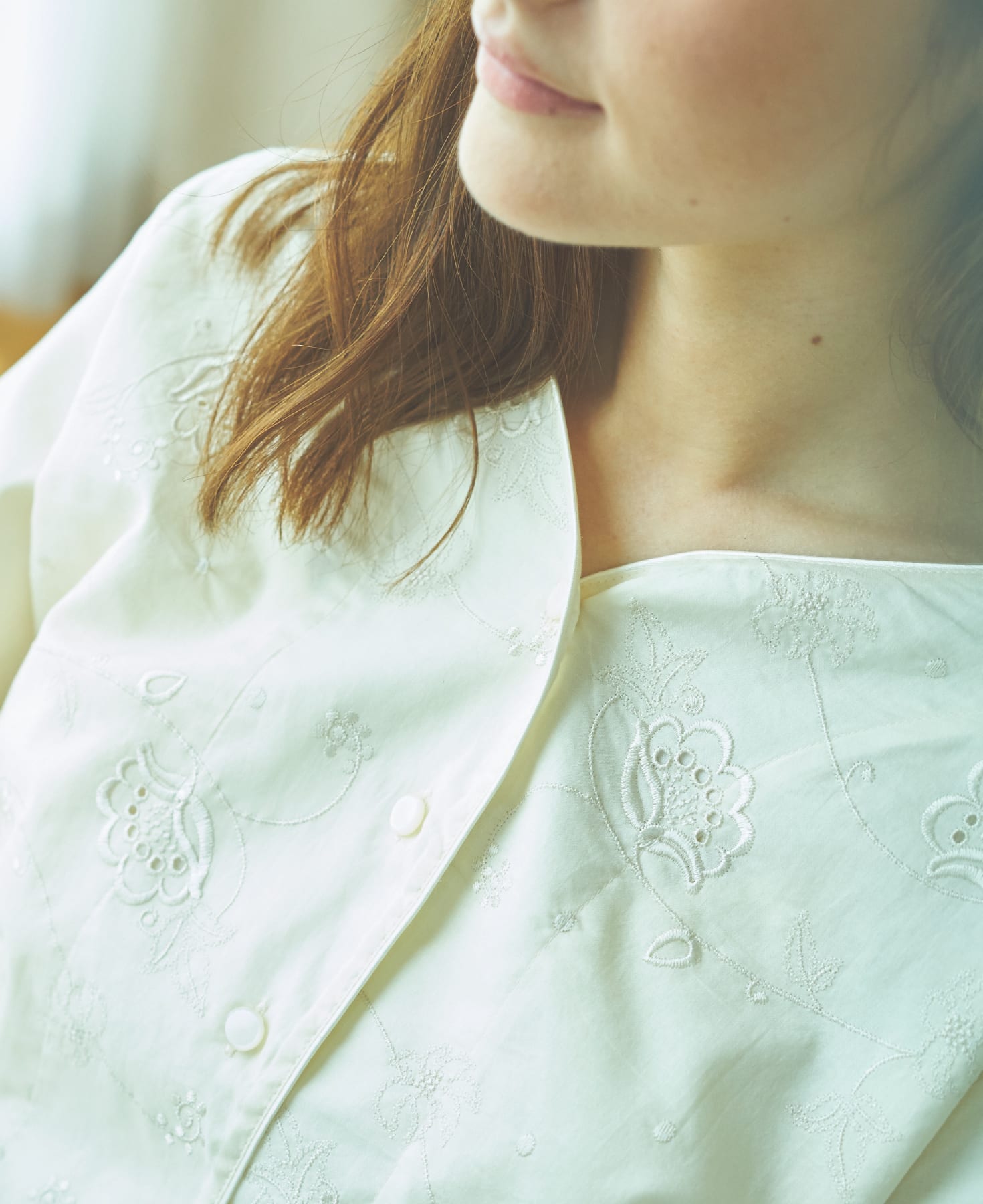 フロントにあしらった上品なエンブロイダリーはオリエンタルな大人の花柄でノスタルジックな印象に。