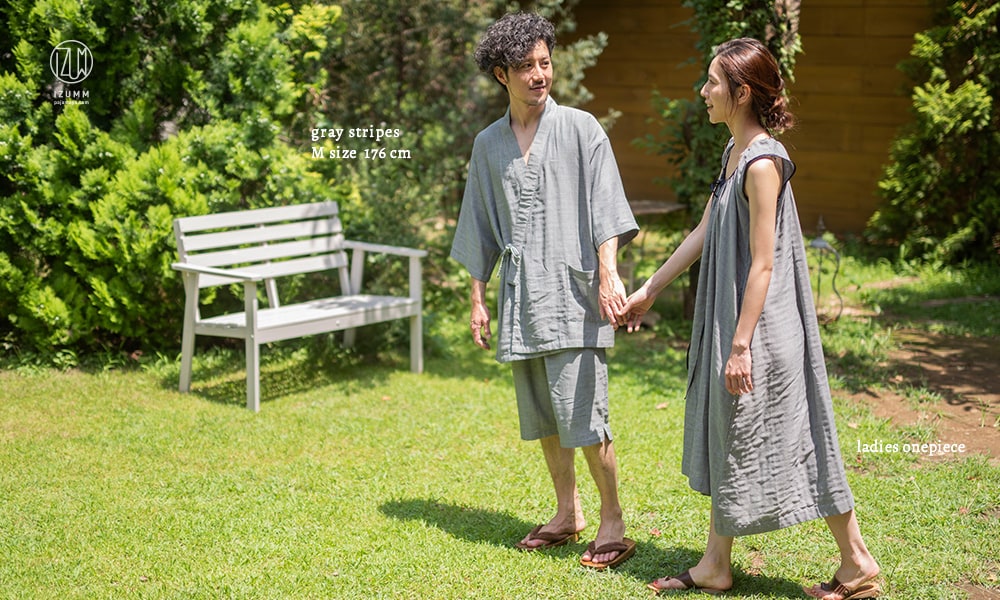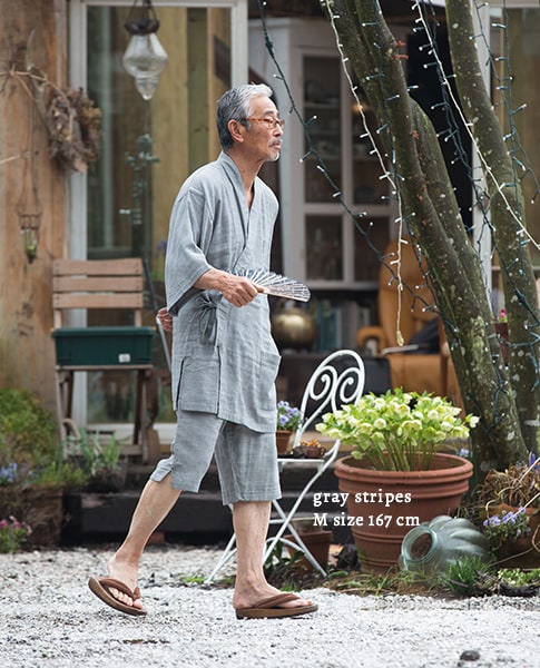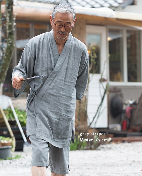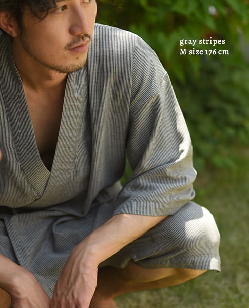 グレーベースに小粋な極細ストライプのダブルガーゼ生地は、汗をかいても快適な綿100%。