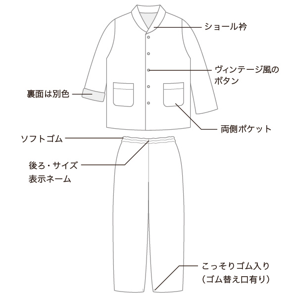 | アイテム&代替可 | パジャマ(上下セット・ぱじゃま)、ガーゼパジャマ(5重ガーゼパジャマ・五重ガーゼパジャマ)、前開きパジャマ、長袖パジャマ | |