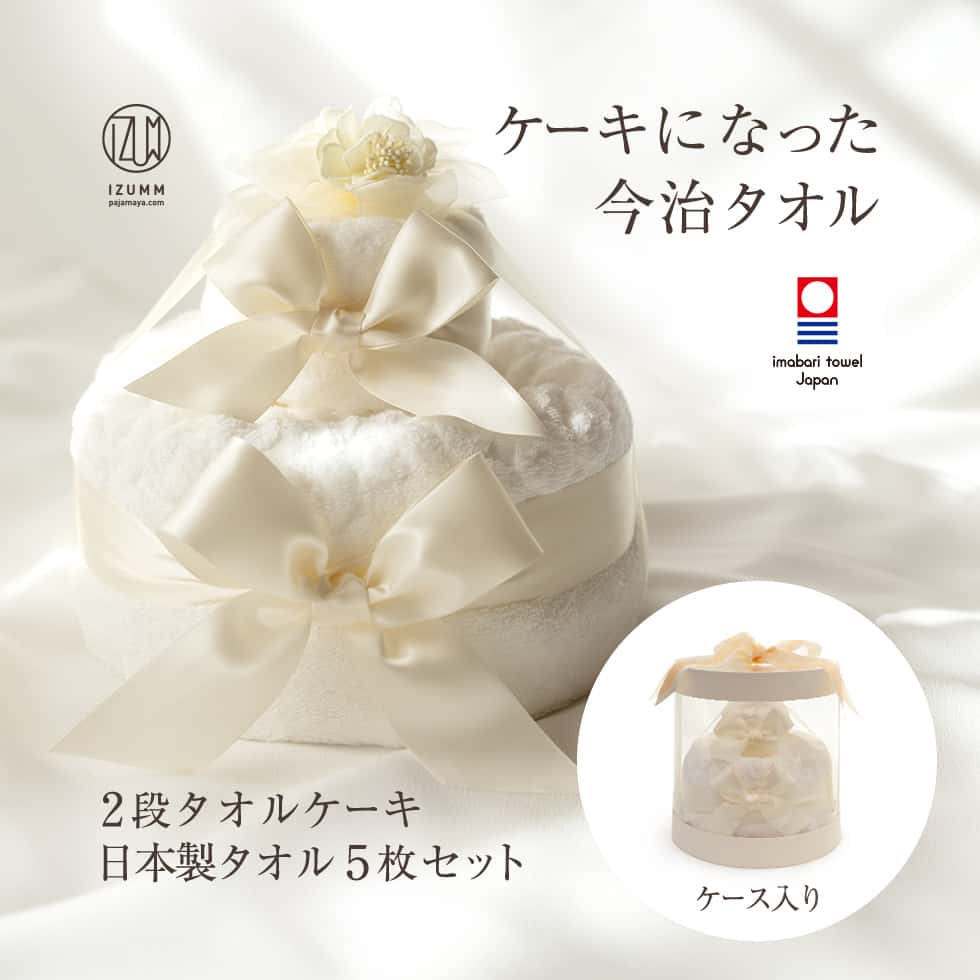 今治産のオリジナルタオル3枚を、デコレーションケーキ風にラッピングしたタオルセット。