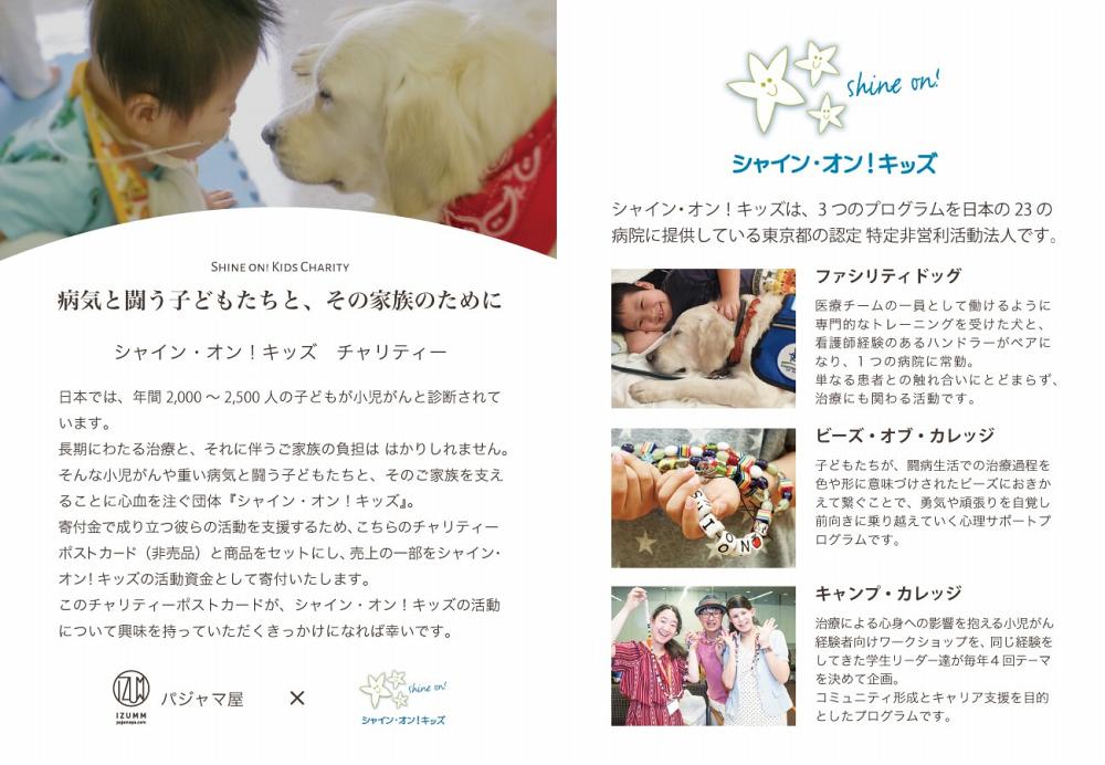 シャイン・オン!キッズのポストカード(非売品)5枚をセットにした対象商品をお買い上げいただくと、その本体価格による売上の10%をシャイン・オン!キッズの活動資金として寄付いたします。