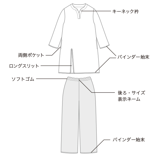 | デザイン詳細 | かぶり(プルオーバー・途中開き・ハーフオープン)、ノーカラー(襟なし・衿なし・キーネック・丸首・丸襟・丸衿・ラウンドネック)、長袖、上着 ポケット 付き(シームポケット・両サイド・両側ポッケ)、上着裾 スリット入り、長パンツ | |