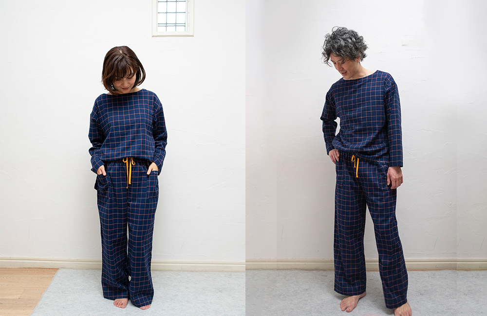 PAJAMAYA IZUMM初となる、ボートネックデザイン。頭の通しやすさと、カジュアルさを意識した襟元は、男女ともにちょうどいい開き具合に調節しています。